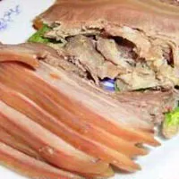 樂安菜肴驢肉為正宗祖?zhèn)?,由崔姓祖先(現(xiàn)居廣饒鎮(zhèn)十一村)研制,始于清代。同治十二年(1873 年)由縣城崔武舉奉薦北京御膳房兵部差務(wù)府,專供食用,久負(fù)盛名。 本品選料精細(xì),以純真健壯的毛驢,采用百年老湯(老湯可連續(xù)使用,使用的次數(shù)越多,時間越長,效果越好,今用老湯乃“文革”前裝入壇中密封壇口,挖坑深埋土中保存至今)新水,配以芳香天然佐料20 余種鹵制而成。鹵成后的驢肉色澤鮮亮,濃香四溢,味美可口,風(fēng)味獨(dú)特,食后回味余久,為今廣饒縣的一絕。是一種高蛋白、低脂肪、常吃不膩的營養(yǎng)佳品。食之具有壯心、補(bǔ)腦、健胃、強(qiáng)身壯骨之效,可增進(jìn)智力,延緩衰老,素有“百肴之長”之稱。 樂安驢肉 原料: 主料:鮮驢肉50 公斤。 調(diào)料:八角100 克、花椒100 克、肉楚50 克、丁香50 克、桂皮30 克、 良姜25 克、白芷30 克、草果50 克、白蔻20 克、小茴香30 克、肉桂20 克、 砂仁50 克、硝酸鈉50 克、老湯50 公斤、鹽2 公斤、清水30 公斤。 制法: 老湯、清水注入鍋中,將八角、花椒、肉寇、丁香、桂皮、良姜、白芷、 草果、白蔻、小茴香、肉桂、砂仁等裝入布袋中,捆好口,放入鍋中,同時 也用清水洗去驢肉血污放入鍋中。上面放上鐵箅子缽壓實(shí)。大火燒開,用中火煮3 小時。在煮制過程中加入鹽。再將硝酸鈉①放入鐵手勺中,在中火上燒溶,燒溶后倒入鍋中,再燜煮8~10 小時。撈出晾涼,切片裝盤即可。① 硝酸鈉使用數(shù)量為0.1%,使用硝酸鈉后,鹵成的驢肉呈胭脂紅色。 特點(diǎn): 顏色鮮艷、濃香四溢、味美可口,是佐酒佳肴。