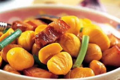 這道菜做法簡(jiǎn)單:取帶皮五花豬肉切成2.5厘米見(jiàn)方的小塊備用,板栗用沸水燙5分鐘后剝?nèi)テ?,在七成熱的油鍋中炸至金黃色撈出。炒鍋置中火燒熱油,放入切好的五花肉炒過(guò),加料酒、精鹽、肉湯、糖色炒至轉(zhuǎn)紅,將拍松后的生姜和蔥、花椒加入,移至小火上煨至快熟時(shí),再放入板栗同燒,待板栗熟透湯濃稠時(shí),去掉姜、蔥即成。特點(diǎn)是色澤紅亮,甜咸適宜,板栗酥香爽口。