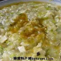 味道鮮而且清,是當(dāng)?shù)卮聿?。豆腐切成豆粒大小,倒進放有高湯的熱鍋里,加上調(diào)料燜幾分鐘,再澆上熟豬油,放上蝦仁、肉蓉、香菇丁和筍尖,一手攪拌,一手撒米粉,再放入碎香菜、濕淀粉和豬油,舀到盤里,澆上麻油,撒些胡椒粉和蔥花即成。