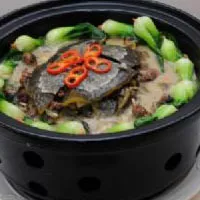 主料:野生活甲魚1100克、薯粉皮300克、蔥頭100克、生姜、米酒、細鹽、醬油、大蒜子、胡椒粉、味精、植物油等各適量。