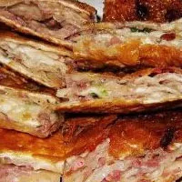制作時(shí),將面粉用八成熱水反復(fù)搋成軟面,蓋上溫布稍餳。帶骨豬肉剔骨洗凈、剁碎,加鹽、水(分次加入),調(diào)攪上勁,再撒上蔥、姜末和花椒面(用時(shí)現(xiàn)摻)調(diào)成餡,將餳好的面搓成長(zhǎng)條,下成劑子,再搓成長(zhǎng)圓條,用搟面杖壓成長(zhǎng)條。攤上餡心,用手扯成長(zhǎng)帶狀,一頭沒(méi)有餡,從攤餡的一頭疊起,把兩頭捏緊,用沒(méi)帶餡的一頭蓋嚴(yán),壓成橢圓形的餅。然后,平底鍋里加入油,燒至五成熱,放入生坯,用小火煎制,兩面呈金黃色即成。煎制時(shí),油隨耗隨添。