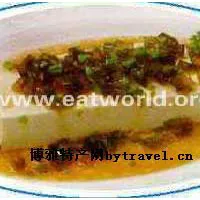 2.烹調(diào):凈鍋放火上,加底油在小火上燒熱轉(zhuǎn)勻鍋底,油至六成熱時,將豆腐完整推入鍋內(nèi),煎黃底面后,用大翻勺將豆腐翻過,再煎成黃色使表面稍硬,加入蔥姜末、清湯、醬油、料酒,蓋上小鍋蓋炯煸至湯汁收盡,成熟后扣在盤內(nèi)即成。