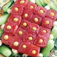 帶子上朝是中國菜系魯菜菜系中很有特色的菜式之一,以花生 為主要材料。其寓意是孔府輩輩做官,代代上朝,水為官府門第,世襲爵位不斷。此菜是用一只鴨子帶一只鴿子,一大一小放盤中,別具風(fēng)味,是宴席大件菜。