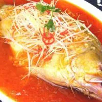 (1)將鮭魚去鱗,剁去脊翅、劃水,從口內(nèi)取內(nèi)臟(用筷子從口中將內(nèi)臟攪出,以保持魚體完整),沖洗干凈,用手捏住魚嘴在開水中一焯,迅速放進(jìn)涼水中,輕輕刮去黑皮斑痣;用刀把魚下巴劃開,兩面打坡刀,放盤中,加料酒、精鹽、蔥段、姜片、花椒腌漬約15分鐘,備用。