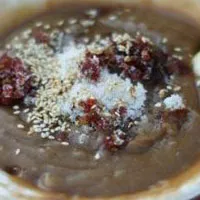 4、沖好一碗后,即在茶湯上撒上紅糖20克、白糖10克和糖桂花1克。也可再撒些金糕丁、青梅丁之類的食品。本配料用量可制作10碗。