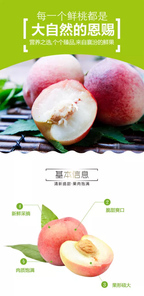 熟后的蟠桃,白中透紅,扎一個小孔,可用嘴把桃汁全部吸光。此桃有“五月鮮”、“薄皮”、“秋