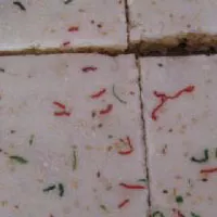 泡子糕是用米粉(江米或黃米)、糖稀、生油配制而成。制造時先炸泡子糕。即是將米放入30度溫水中,泡至用手捻碎而不粘為宜,撈出晾干,粉碎成面團,入鍋加熱攪拌,熬成稠糊狀和糖稀一并倒入合面機,再加面粉合成面團,用軸搟成厚約5毫米的長方形,用刀切成多層面片,炸呈杏黃色為止。第二道工序是鋪糕。鋪糕即是用糖稀熬好漿子,再加適量香精、桂花醬,后將糕泡子入鍋攪拌,隨澆漿子調勻倒入熟面,再把攪好的糕泡子倒在案子上攤勻,上面鋪一層白糖皮,撒上青紅絲,蓋紙軋實,切成塊即成。
