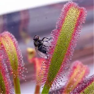 茅膏菜是一類有趣的食蟲(chóng)植物,它們大多生長(zhǎng)在山麓原野低濕地、沼澤地和濕草甸上,多數(shù)為小型多年生草本植物。茅膏菜科有4個(gè)屬,茅膏菜屬約有90個(gè)種。茅膏菜一般分布在熱帶和溫帶地區(qū),有半數(shù)以上分布在澳大利亞,我國(guó)有6個(gè)種。 茅膏菜是被動(dòng)捕捉型食蟲(chóng)植物,根據(jù)其葉片形狀,又可分為圓葉茅膏菜和長(zhǎng)葉茅膏菜。 有一種圓葉茅膏菜叫做毛氈苔,為多年生小草,葉片叢生,呈放射狀展開(kāi)。在那圓圓的葉片上,生有200多根觸毛,觸毛長(zhǎng)短不一,四周長(zhǎng),中間短,形成一個(gè)小凹兜。每根觸毛的頂端有一個(gè)粉紅色的小球,小球上分泌有一層粘液,看上去好似一顆顆晶瑩的紅色“露珠”。這種“露珠”不僅有鮮艷的色彩,而且還有香甜的氣味,以引誘昆蟲(chóng)上鉤