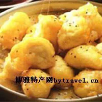 菜式配料 白薯(又叫地瓜)400克,桂花醬2克,芝麻油少許,白糖200克,花生油500克(耗50克)。 菜式制作 1.準(zhǔn)備工作:將白薯洗凈削去皮,切削成球形。 2.烹調(diào):炒勺放旺火上,加花生油燒至七成熱,放入白薯球,炸至呈金黃色撈出,炒勺內(nèi)留油約20克,放入白糖,炒至呈金黃色,并冒青煙起氣泡時(shí),迅速倒入白薯球,加入桂花醬,顛翻均勻,使糖汁均勻掛在撉驍?shù)闹車(chē)?。先在盛盤(pán)上抹少許芝麻油,將球倒入盤(pán)內(nèi),迅速送到食客桌上,食時(shí)可以當(dāng)即拔出糖絲。 上桌前為防止糖液粘筷,先端上一碗清涼水,先將筷子蘸水,然后挾拔絲糖球。食者應(yīng)盡快下筷,防止涼后凝固,絲就拔不出了。