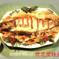 主料:鮮鮭魚1條1000克輔料:雞脯肉200克、肥膘100克、火腿肉150克、雞蛋清50克佐料:料酒60克、白油200克、清湯500克、細(xì)鹽8克、蔥段10克、姜片6克、蒜片60克、花椒4克(布包好)白面260克烹飪工藝:(1)將鮭魚去鱗沖洗干凈,在腹部和尾端切斜口,去凈魚鰓、魚口去除內(nèi)臟,沖洗干凈,切去下頜骨,在去腹鰭,脊鰭,熱水燙過(guò),在刮一次魚鱗,兩邊打斜刀象眼塊。(2)將雞脯內(nèi)去掉白筋,與肥肉膘一起切碎,砸成細(xì)泥,加蛋清、料酒、細(xì)鹽、清湯調(diào)成稠糊狀。(3)將火腿切成長(zhǎng)條片,與雞料子一起,填入刀口內(nèi),用花包好,將白面和好。搟成棉皮,撒上蔥、姜末和花椒面,在放上,四周包好捏緊,將烤爐預(yù)熱至80攝氏度,放入以面包好的鮭魚,急火烘烤約半小時(shí),至包面烤裂為好,取出打開面,慢慢取出鮭魚。(4)取面粉150克和好分成兩份,用西紅柿和蛋黃分別和好,分為紅、黃兩色搟成筷粗的條,置于模具內(nèi)壓成花籃形,放入油鍋炸熟至金黃色取出,制成長(zhǎng)方形花籃,把魚托入花籃內(nèi),姜末香醋一起上桌。 風(fēng)味特點(diǎn):此菜形如花籃,工藝精巧別致,魚味鮮美、肉嫩鮮香,是孔府宴中吉祥之菜,有”富貴有余“之寓意。( 東營(yíng))