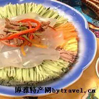 ⑤將粉皮切成5厘米長的條,放入另一碟中,周圍順序擺上肉絲、木耳、黃瓜、蛋皮,淋上麻汁水即可!