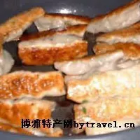 油煎鍋貼一種是帶餡,一種無餡。大小約為水餃的兩倍。餡可以隨自己的喜好調(diào)制。一般是豬肉(芹菜肉、蘿卜肉)或素餡(白菜豆腐、素三鮮)等等。包好后一個個貼到熱油鍋里。在加熱的過程需要翻動幾下。無餡的鍋貼為長條形。是將面搟成皮,抹上油鹽蔥,卷成條狀,然后扭一下。做好后同有餡鍋貼一樣放到鍋里煎熟。剛出鍋的鍋貼最好吃,香噴噴的,看著熱油還在上面沒有完全退去。忍不住咬一口,雖說有點(diǎn)燙,但是香香的夠滋味的美味已經(jīng)到了嘴中……