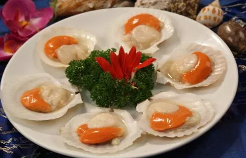 三絲原鮑扇貝長島名菜。以鮑魚、扇貝為主料,將鮮鮑魚肉去邊洗凈,在正面剞十字花刀,放開水中焯熟,盛入洗凈的鮑魚殼內(nèi),擺在盤子周圍。把干紅辣椒絲、竹筍絲、香菇絲用開水焯一下,撒在鮑魚上。勺內(nèi)加清湯燒開,放入精鹽,勾芡之后,淋上雞油澆在鮑魚上;把鮮扇貝柱放開水中焯至八成熟撈出。勺內(nèi)放底油,下蔥、蒜爆鍋,加料酒、清湯、食鹽燒開,勾上芡,放入扇貝翻炒幾下,倒入盤子中即成。