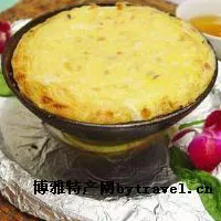 鐵鍋蛋是河南一種古老的傳統(tǒng)名小吃。據(jù)傳始創(chuàng)于明清時期,當(dāng)時一家河南菜館的廚師,為了增加雞蛋菜肴的風(fēng)味,把蛋液打勻后,加入蝦米、肉丁、香菇丁和鮮湯等調(diào)和,放入特制的鐵鍋內(nèi),煮至半熟時,再用燒紅的鐵鍋蓋蓋在上面烘烤,使蛋料膨脹熟透。 鐵鍋蛋的特色:色澤鮮艷,松嫩鮮香。 鐵鍋蛋的做法:1、將雞蛋磕入大碗內(nèi)打勻,放入各種原料和調(diào)料再打勻,加入鮮湯繼續(xù)打勻,倒入特制的鐵鍋內(nèi)。特制的鐵鍋蓋放在火上燒紅待用。2、鐵鍋置小火上,蛋漿中注入熟豬油,用鐵勺慢慢地推動,以免粘鍋。待蛋料八成熟時,淋入熟豬油少許,用火鉤鉤住燒紅的鍋蓋,蓋在鐵鍋上,使蛋料脹至有光澤,烤至紅、黃色。3、取搪瓷盤一個,里邊墊上青菜葉,加入香醋。然后揭開鍋蓋,將“鐵鍋蛋”盛入搪瓷盤內(nèi)的菜葉上即成。 制作要領(lǐng):1、打蛋液時要朝一個方向攪打上漿;2、鐵鍋烘烤蛋料時要用微火,以免烤焦煳。
