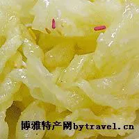 姜汁排叉,從其名就可知道,它原料中有鮮姜,因而食用時(shí)有明顯的鮮姜味而得名。 它要用鮮姜去皮剁成細(xì)末,面粉加一定比例的明礬末,一起放入盆中,用涼水和成面團(tuán)。還有一種方法是用水和面,放在軋面機(jī)上軋五六次,直軋到薄片均勻光滑,然后在薄片上撒上細(xì)淀粉面,疊起合成長(zhǎng)條后,用刀切成寬2厘米、長(zhǎng)5厘米的排叉條,將兩小片疊到一起,中間順切三刀,散開成單片套翻在一起,用溫油炸。將炸好的排叉過蜜,過蜜的方法是用鮮姜去皮切細(xì)絲,用水把姜絲熬開后撈出姜絲,放入白糖,開鍋后放飴糖、桂花,繼續(xù)熬開后移小火上,將炸得的排叉入姜汁熬出的桂花飴糖中過蜜。 過蜜后的排叉成淺黃色,有酥、甜、香的特點(diǎn),食用時(shí)有姜味。南城“南來(lái)順”的姜汁排叉1997年被評(píng)為“北京名小吃”,同年又獲“中華名小吃”稱號(hào)。 還有一種帶咸味的排叉,原料為面粉、蘇打和鹽,也用油炸,做法與姜汁排叉一樣,不同的是它不過蜜,有酥、脆、味微咸的特點(diǎn),愛喝酒的人常以咸排叉當(dāng)下酒菜用。 據(jù)《天橋小吃》作者張次溪先生說(shuō):“舊天橋有專門賣小炸食的店家,如面炸不盈寸的麻花排叉,用草紙包裝,加上紅商標(biāo),是過年送禮的蒲包,又是小孩的玩物?!睂?duì)這種小炸食前人還有詩(shī)稱贊說(shuō):“全憑手藝制將來(lái),具體面微哄小孩。錦匣蒲包裝飾好,玲瓏巧小見奇才?!边^去天橋賣這類小炸食的還要吆喝:“買一包,饒一包,江西臘來(lái),辣秦椒。大爺吃了會(huì)撂跤,撂私跤,撂官跤,跛子跛腳大箍腰。大麻花,碎排叉,十樣錦的花,一大一包的炸排叉?!毙『⒙牭搅?,多歡喜去買。