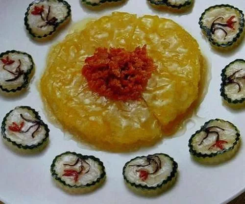 蟹黃鮰魚肚為當(dāng)?shù)孛恕F渲品椋壕x茅山大母蟹兩只,將蟹腳用線扎緊,以免蟹黃流出,上籠蒸二十分鐘,取出,刮出蟹黃,剝出蟹肉,將鮰魚肚灰塵抹去。將砂鍋放在火上,下豬油一斤二兩,隨著放下魚肚,等鮰魚肚松軟起泡,將鍋拿起,待熱油浸泡十分鐘,撈出魚肚片破兩邊,再入油鍋,用溫水使油滲透魚肚,起鍋后放入冷水中發(fā)透,切成薄片。再將少許燉堿用熱水燙一下,以便松軟,再用熱水將堿水洗清備用。將炒鍋鍋旺火上,下豬油八錢,姜末少許,連同筍絲、冬茹絲,蟹黃、蟹肉同時(shí)鍋爆炒,下高湯三勺,再下魚肚,再加味精、醬油、鹽、豬油七錢,用濕淀粉勾芡,加醋,用鐵勺推動(dòng)幾下,起鍋盛盤,撒上蔥花、胡椒即成。( 浠水)