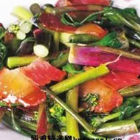洪山菜薹炒臘肉,做法很講究。菜薹要選洪山寶通寺周圍種植的,要既鮮且嫩,主要吃薹,薹用手折,長約寸許,洗凈瀝干備用。臘肉也要切成一寸長的薄片,先放進(jìn)鍋里煸妙,然后撈起,再炒菜薹,最后把臘肉摻入,起鍋裝盤。吃時(shí)菜薹鮮嫩脆香,臘肉醇美柔潤,別有風(fēng)味。( 武漢)