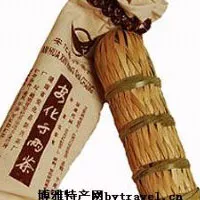 “千兩茶”,即花卷茶,因一卷茶合老稱約重一千兩。該茶用棍錘筑制在長筒形的篾簍中,筑造成圓柱形。高147厘米,直徑20厘米。重約36.25公斤。制作材料:此茶以蓼葉裹胎,外包棕片,再用竹篾捆壓箍緊,黑毛茶是立夏前后采摘的全花白梗茶而制作的。