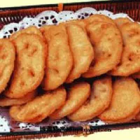 ①將藕切去節(jié),削去皮,一切二開(kāi)成半圓形,平放在砧板上,凸出的一面朝上,先切0.3厘米厚(不切斷,切3/4深,)再切0.3厘米厚(切斷),如此切完為止用少許鹽腌軟。