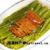 醴陵黃菜細(xì)切如絲,佐高湯蔥花,吃起來嫩、爽、滑、脆、鮮、香齊備。黃菜之有其名,據(jù)父老口傳,當(dāng)是在清末民初。那時(shí)水運(yùn)發(fā)達(dá),在水上靠船討生活的人家很多,醴陵產(chǎn)的生豬、谷米、瓷器、鞭炮、夏布等,靠船運(yùn)出,而醴陵需要的日常生活用品,也得要靠船運(yùn)進(jìn)來。船將出發(fā)時(shí),家人抱來大捆芥菜,洗凈,用木桶裝好,再燒一鍋開水,往桶里一倒,然后蓋好蓋。中午,船入湘江,也到該做中飯的時(shí)候,揭開蓋子,桶中芥菜也成了黃菜,此時(shí)倒掉桶中黃水,將整片的黃菜漂洗一下,換上清水,以后每日換一次水,桶中黃菜既不會(huì)腐爛,也不會(huì)變味,隨吃隨取,極其方便,船家就省去了上岸買菜的麻煩,還節(jié)約了開支。