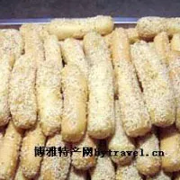 麻通是吳川糖果生產(chǎn)中的獨(dú)特名優(yōu)產(chǎn)品,該產(chǎn)品系用大糯米、水芋頭、白糖、芝麻等原料,經(jīng)過特殊的處理方法和制作技術(shù)做成半成品,曬干后隨時(shí)備用。再加工制作時(shí),將此半成品先后投進(jìn)分別用文武火煮成不同溫度的兩個(gè)油鍋中去炸,炸至膨脹適度,取出淋上白糖膠,灑上芝麻即成。成品粗如甘蔗,長(zhǎng)7~8公分,中空充滿泡沫,入口松脆香甜,是糖果中佳品。麻通的制作,在吳川已有一百多年歷史,但其制作技術(shù)長(zhǎng)期秘傳,直至60年代才公開。( 吳川)