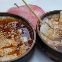 陽(yáng)春砵仔糕,砵直徑10厘米,高3厘米,內(nèi)放粘米漿,放置蒸架中武火40分鐘蒸熟,觀砵邊是否皺皮,為之熟透。吃法放置花生蒜油、秘制醬油、花生粉末,切方塊狀用竹簽沾醬于花生一起入口??诟兴瑥椦?,醬香四溢,既有蒜的焦香味又有花生的脆香味,再蘊(yùn)含米糕著軟滑彈牙真的是回味無(wú)窮,吃而不膩。