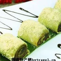 豆面糕又稱(chēng)驢打滾,是北京小吃中的古老品種之一,它的原料是用黃米面加水蒸熟,和面時(shí)稍多加水和軟些。另將黃豆炒熟后,軋成粉面。制作時(shí)將蒸熟的黃米面外沾上黃豆粉面搟成皮,然后抹上赤豆沙餡(也可用紅糖)卷起來(lái),切成100克左右的小塊,撒上白糖就成了。制作時(shí)要求餡卷得均勻,層次分明,外表呈黃色,特點(diǎn)是香、甜、粘,有濃郁的黃豆粉香味兒。