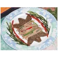 2、猛火燒鑊下油.把米粉絲炸過,撈起候用。將甲魚絲拌上蛋清,上濕生粉,與甲魚裙絲分別拉油至熟,倒入放在油盆上的笊籬中濾油后,下料頭、筍絲先炒,再下蒜心、菇絲、水魚絲、裙絲等,注入上湯,濺酒調(diào)味,加入老抽、蠔油,撒上胡椒粉,用濕生粉勾芡,加包尾油炒勻上碟,將炸好的米粉絲分伴四邊即成。
