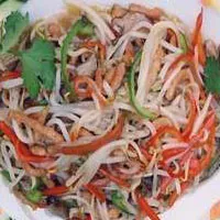 3、將雞絲拉油,撈起,下姜米爆香,接著先下筍絲炒片刻,隨即加入其余原料同炒,注入上湯,濺酒,調(diào)味,加入麻油,撒上胡椒粉,用濕生粉勾交,加包尾油炒勻上碟,將炸好的蛋絲分伴四邊。