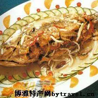 炸荷包魚 用料: 龍箭魚1條(約500克),瘦豬肉100克,肥豬肉50克,香菇10克,方魚5克,雞蛋1個(gè)芹菜末10克,荸薺肉50克,白醋40克,白糖150克,生油1000克(耗50克),味精、精鹽、胡椒粉、蔥、姜、香椒、雪粉各少許。 制法: (1)先將魚去鱗去鰓開腹去內(nèi)臟,用小刀把魚的肉和骨取出,要留頭尾,尾帶皮,并把魚肉取出待用。 (2)把魚肉和瘦肉剁成茸,和入肥肉粒25克、香菇粒、方魚末、芹菜和胡椒粉、精鹽、蛋白、味精拌勻成餡后,釀入魚肚并撒上干粉。 (3)燒熱炒鼎,倒入生油,候油熱時(shí),將魚放進(jìn)鼎里炸至酥赤盛在盤里,用芹菜絲、肉絲、香菇絲、肥肉絲25克下鼎炒香,放入白糖、白醋、姜末、蔥末、蔥、香椒和上湯少許勾薄芡淋上即成。 特點(diǎn): 色澤金黃,酥香鮮美。