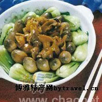 紅燉海螺 用料: 凈角螺(也可用其它海螺)600克,草菇和濕香菇50克,火腿肉20克,粗骨150克,豬肚肉250克,精鹽5克,味精4克,蠔油5克,上湯500克,姜5克,蔥5克,芫荽頭5克,胡椒粉0.2克,麻油3克,菜心150克。 制法: (1)將角螺擦洗干凈,用滾水滾過(guò)待用。把粗骨斬塊和豬肚肉切成大塊,一起用滾水滾,火腿切成幾片待用。 (2)把竹篾編墊在高壓鍋底,然后放入螺肉和倒入上湯,再將粗骨、豬肚肉蓋上,把火腿片、精鹽、姜蔥、芫荽頭一起放入,將蓋蓋密,先用旺火煲滾上氣,后轉(zhuǎn)中火煮20分鐘,待其退冷。 (3)將草菇或香菇用油炸過(guò),菜心炒過(guò),將已壓好的螺肉和湯汁取出,放入炒鼎,同時(shí)把草菇放入,加入味精、麻油、蠔油、胡椒粉煮滾,用少許粉水勾芡盛入盤(pán)中,四周用菜心拌邊即成。 特點(diǎn): 鮮香嫩滑,濃香入味。
