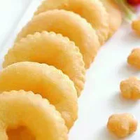 和平縣有制作紅薯餅的風俗。產(chǎn)品色澤金黃,外酥內嫩,香甜爽口。 一、原料配方: 紅薯300g,面粉250g,發(fā)面200g,紅糖50g,白糖、糖桂花、干淀粉各25g,堿面25g,花生油750g。 二、制作要點: ①紅薯處理:紅薯洗凈,去皮,蒸爛,晾涼,放入盆中,加紅糖、糖桂花、干淀粉,揉搓成紅薯泥。 ②面團的調制:面粉內加清水150 g和成水面團;把發(fā)面與白糖拌和揉勻,再把水面團和白糖發(fā)面混合,加入堿面,揉勻揉透。 ③做形:將面團搟成長方形面片,把紅薯泥倒在面片上,用鏟子蘸油,將薯泥抹勻,然后由外向內卷成卷,橫切成10塊,平放整齊,再撒上一層層薄薄的面粉,用面杖搟成圓餅。 ④油炸:將鍋置火上,倒入花生油,燒至六成熱時,將薯餅入鍋炸3分鐘,撈出瀝油即成。產(chǎn)品色澤金黃,外酥內嫩,香甜爽口。