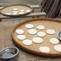 此時持舂杵人要趁熱用舂杵把膠狀糊拖將出來,放在早已準(zhǔn)備好的用蜜臘混茶油涂抹過的竹簸箕上,由一個熟練的婦女趁熱把糯米團分成一個個鉛球大小的糍團,再由其他姑娘、少女、小伙將糍團拍成扁圓體,攤放在大簸箕上晾干。