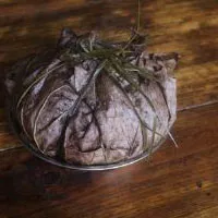米粉和濕均勻,干濕要適度,然后用荷葉把和好的肉、粉包成圓錐形,根據(jù)荷包糌的數(shù)量多少上甑蒸數(shù)小時方可食用。