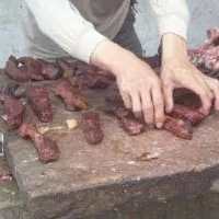 在豐陽鎮(zhèn)街市的牛肉檔口,檔主們搭起烤爐,一邊取鮮肉一邊進行熏烤,可謂現烘現賣。豐陽牛肉干受到歡迎,一在于選料精,二在于燃料用雜木。再將牛肉干拌以辣椒豆豉或蒸或炒,吃時輕嚼慢咽,余味無窮,口齒留香。