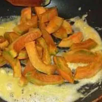 4、再在鍋里放入油(少量),將壓碎的鴨蛋黃放入鍋中用小火炒。等炒到起氣泡,加入少許水,(將蛋黃稍微稀釋)。在當(dāng)中加入少許鹽和雞粉調(diào)味,最后把炸好的南瓜倒入鍋中均勻地翻炒,直到蛋黃全部沾滿南瓜即可。