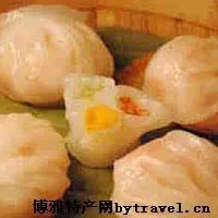 以燙面皮包裹肉餡蒸制而成。其色如蛋黃,皮薄,軟韌爽滑,餡嫩湯旺,以香醋佐食,鮮美而有醋酸和堿味的芳香。此品有數(shù)百年的歷史?!峨S園食單》記述:“顛不棱即肉餃也,糊面推開(kāi),裹肉為餡蒸之。其討好處全在作餡得法,不過(guò)肉嫩去筋作料而已。余到廣東,吃官鎮(zhèn)臺(tái)顛不棱,甚佳,中用肉皮煨膏為餡,故覺(jué)軟美?!比馄れ懈?,即如今的豬皮凍。拌餡時(shí)加入,遇熱即熔化為湯汁。以此法灌湯簡(jiǎn)單易行,在廣東一直沿用至清末民初。30年代,廣州著名點(diǎn)心師把它改為豬皮凍中酌加瓊脂,或在夏天全用瓊脂,使湯汁既旺而又膩口。同時(shí),又以蛋液、堿和面,擦至純滑作皮。這樣,可使其結(jié)構(gòu)緊密,質(zhì)爽滑而稍韌,能搟壓至較薄而不穿破,使灌在餡中的湯汁不致漏失。
