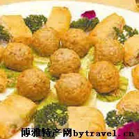 “香滑魚球”是廣東傳統(tǒng)名菜。所用鱸魚肉本是長方形塊狀的,之所以稱球,是因?yàn)樵瓉淼淖龇ㄔ隰~塊上刻有刀花,熟后,魚塊自然彎卷,微有球形之故;近年有所改變,已不刻花,這樣,魚塊熟后就不出現(xiàn)球狀,但人們?nèi)粤?xí)慣以魚球稱之。成菜嫩滑鮮香,故名“香滑鱸魚球”。