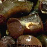 壯家人最普遍最愛吃的血制品當數(shù)龍捧(“捧”為壯語,譯讀bóng)。在鄉(xiāng)間,不管哪家殺豬,都要灌龍捧:用煮熟的糯飯、蔥、蒜、姜絲一起加入生豬血中,拌勻,用漏斗(宜州人叫“灌筒”)把它們一起灌人豬小腸內(nèi),用禾草扎緊兩頭.則得一條直徑約一寸多的長“蛇”,盤起放人湯鍋里煮熟,即可切為三四寸長小截用手拿吃。龍捧不是桌上菜,只是老人小孩吃玩耍的零食。壯家還有個不成文的規(guī)矩,不論哪家殺豬,要灌龍捧,并將煮好的龍捧分成小段給上門來玩的老人小孩吃,還分發(fā)到左鄰右舍、親友的家中。如果誰家不舍得灌龍捧分給親友鄰舍,則被視為“利未”鬼(宜州方言即吝嗇鬼),不懂人情世故。一截短短的龍捧,在壯鄉(xiāng)里卻蘊藏著壯家人樸實的深情厚意。