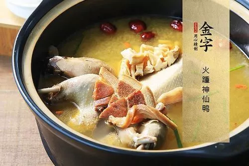 此菜火踵鮮紅濃香,鴨肉肥嫩油潤,原汁原味,營養(yǎng)豐富,誘人食欲,是1956年浙江省認(rèn)定的36個(gè)杭州名菜之一。