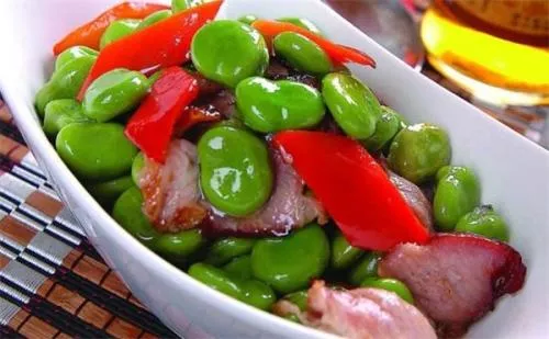 1、將蠶豆除去豆眉,用冷水洗凈,在沸水中略焯。熟火腿切成0.3厘米厚、1厘米長方的丁。2、鍋置中火上燒熱,下色拉油至150度時,將蠶豆倒入,約煸10秒鐘,把火腿丁下鍋,隨即放入奶湯,加白糖和精鹽,燒一分鐘,加入味精,用濕淀粉調(diào)稀勾芡,顛動炒鍋,淋上雞油,盛入盤內(nèi)即成。