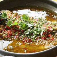 2、炒鍋下油燒至五成熱,下泡紅辣椒、郫縣豆瓣、辣椒粉、姜米、花椒炒香,油呈紅色,下鮮湯、料酒、泡蘿卜、味精熬出味。