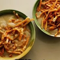 油茶馓子做工精細(xì),先將白米打碎為細(xì)粉,放入鍋中加清水?dāng)嚦上{糊狀,然后加熱,文火慢煮,待米糊煮熟粘勺子時(shí),加入少許糖汁水,使之變?yōu)樯铧S色,便可起鍋入碗。