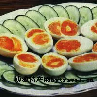 陳年糟蛋產(chǎn)于四川宜賓。宜賓“敘府陳年糟蛋”是把鮮鴨蛋采取糟腌制而成的。糟蛋腌制過(guò)程中,要?dú)v經(jīng)三期 規(guī)程,十幾道工序,其中尤以敲蛋工序最為嚴(yán)格。須用小指粗的竹棍輕輕敲擊蛋殼, 以蛋殼輕微破裂,蛋膜完整無(wú)損為合格。從生產(chǎn)到翻壇儲(chǔ)存一年方能出廠,三年以上 者味道更佳?!皵⒏惸暝愕啊钡某苑ê芴貏e:先把糟蛋置于碟中,加適量白糖,再滴白酒少許, 用筷略微攪動(dòng),待蛋、糖、酒融為一體后,即可徐徐拈食下酒,別有風(fēng)味。其蛋質(zhì)軟嫩,色澤紅亮,醇香味長(zhǎng),營(yíng)養(yǎng)豐富。1982年,被商業(yè)部評(píng)為優(yōu)質(zhì)名特食品。