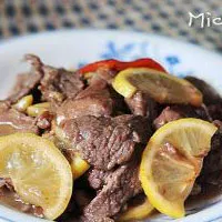 材料: 牛肉4兩,青椒粒、洋蔥粒各2湯匙,檸檬1只。 腌料:生抽1.5茶匙,檸檬茸2/1茶匙,生粉1.5茶匙.調(diào)味: 檸檬汁4/1杯,糖4/3湯匙,鹽8/1茶匙,水2湯匙,生粉 水適量. 做法: (一)牛肉切成薄片,放入腌料拌勻,泡油后濾干油份 上碟. (二)檸檬皮磨茸2/1茶匙,切絲約1湯匙.將檸檬肉榨 汁約4/1杯,混合調(diào)味料待用. (三)用2/1湯匙油將洋蔥爆香加入青椒粒,檸檬絲炒 勻注入調(diào)味料,用少許生粉水打芡淋在牛肉上面即成.注意: "檸檬牛肉"是開胃的菜式,牛肉中只能加檸茸,使有 檸香.其它的檸檬味盡在芡汁中,是色、香、味俱有的菜。( 成都)
