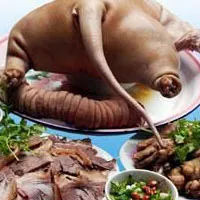 花江狗肉是一種聞名全國(guó)的風(fēng)味小吃。它的烹飪方法很獨(dú)特,原料、加工過(guò)程、配料也非常講究。據(jù)“貴州花江狗肉館”的黎族大師傅介紹,做花江狗肉時(shí),要選擇30斤左右的成年公狗做原料,以保證肉肥瘦均勻、嫩而不老。然后像殺豬一樣的宰殺狗,把狗血全部放出來(lái),不剝狗皮,再用開水把毛燙掉。狗皮香、薄、有咬勁、可美容,因此從來(lái)都不去狗皮。而其他地方在做狗肉時(shí),一般是將活狗直接打死、吊死甚至毒死,再將皮一剝就了了事,狗血全瘀在肉里,燒出來(lái)肉不好吃。同時(shí)毒死、病死或是死了很久的狗的狗皮剝不下來(lái),毛也去不干凈,因此花江狗肉上有皮無(wú)毛,也是他們質(zhì)量可靠的一個(gè)標(biāo)志。將狗毛、狗骨、狗內(nèi)臟完全除去后,就可以把肉放到特制的砂鍋鼎罐中,加上從貴州當(dāng)?shù)剡\(yùn)來(lái)的花椒、生姜、陳皮、八角、山奈、砂仁、薄荷草等作料,和一些用來(lái)去掉狗的土腥味的藥草,用文火慢慢來(lái)燉了。燉時(shí)用小火,是為了防止湯汁稠濃。水要一次性放足,中間不加水、保持原湯,讓肉香都燉出來(lái)。一般燉到狗肉八九分熟就差不多了,出來(lái)后湯清爽而鮮美,肉細(xì)嫩而純香。 花江狗肉的吃法也頗為獨(dú)特。燉好的狗肉被切成薄片或塊狀,整齊地排在盤子里,盤子邊上是加了姜、胡椒粉、蔥花、芫荽、味精的狗肉湯,以及用幾十種調(diào)料做成的蘸料。吃的時(shí)候,將狗肉放到滾燙的狗肉湯中,原本八九分熟的狗肉立刻被燙熟了,再舀點(diǎn)狗肉湯到蘸料中,蘸料立刻就化開了。大伙邊蘸邊吃,真是又燙又辣、又麻又香。 貴州(花江狗肉)操作全部過(guò)程:1退毛(水的溫度在60--70之間)退好沖洗干凈。去骨:(破腹開始去骨。。不要外面去。。這樣就損壞外面的皮。保持狗皮完整》去骨以沖洗。再過(guò)下水。這樣去掉狗骨頭的狗肉就收縮。再用噴火槍把余下的毛噴好。再?zèng)_洗干凈。。2煮狗肉的過(guò)程。。水燒開以后放狗骨頭。。狗肉(去掉骨頭的狗肉)里面再放砂仁。.(15來(lái)個(gè))姜4兩。對(duì)葉連1兩。。煮過(guò)程中用中火。。皮軟就可以。3鍋底過(guò)程::用豬油和菜油(豆油也可)放姜和蒜苗和狗肉一起抄上1--2分鐘。。放煮好狗肉的原湯;再放砂仁。(湯料粉.)鹽/狗肉香/木姜花粉/胡椒/味精。雞精/轉(zhuǎn)轉(zhuǎn)香/雞肉精粉/起鍋。里面再放蔥花/香菜/大棗/////4粘料過(guò)程:香菜和蔥花放在碟下面/再放糊辣椒面/ 花椒粉。味精。(沾料粉)雞精。轉(zhuǎn)轉(zhuǎn)香.木姜花粉。鹽/狗肉香粉/再放蒜末在上面。。用高溫油淋下。。(關(guān)鍵地方淋油過(guò)程))—(高溫油的里面有1/3是小磨香油。再放少量的胡椒粉在高溫油里面/。但是要控制油的溫度。淋好高溫油后。再放豆腐乳。。(花生。芝麻。抄香的)即可
