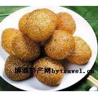 制作方法:炸。糯米淘洗干凈浸泡后,加水磨成米漿裝入布口袋吊起,待水分濾干后放置4-5小時,讓吊漿面自然發(fā)酵至略有酸味后,加堿、糖揉勻搓成長條,下每個約重25克的劑子20個,搓成圓球形后,粘上芝麻入溫油鍋中炸,邊炸邊用平漏勺背反復(fù)踏壓炸至泡空起來,殼呈金黃色即可。