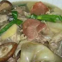 4. 取碗一個(gè),將整香菇整齊排列碗底呈圓形,將甲魚裙邊圍在四周,汆肉切成丁,與八寶配料一起加入熟豬油、蝦子、白糖和部分原湯,拌勻后裝入碗內(nèi);