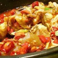 陽郎雞 出產(chǎn)于息烽陽郎壩的一道火鍋菜式,以當(dāng)?shù)禺a(chǎn)土雞和辣椒、大蒜為主要原料。雞肉嫩而糯,那種香噴噴的辣辣的滋味悠長而綿軟。 極辣。雞是現(xiàn)殺,雞血可生吃,但需要事先說明。貴陽街頭有許多打著“陽郎雞”招牌的店,價(jià)格在18元左右一斤,可以只要半只。 做法:把雞砍成均勻大小,勾芡,放鹽,拌勻腌制好擱一邊備用。油燒至六成熟,雞塊下鍋,爆炒至幾乎看不到血色,雞肉基本成熟時(shí)裝入高壓鍋,中火燜6~8分鐘后離火。再放油燒至七成熱,下糍粑辣椒,辣椒熟后,放入豆瓣醬,大蒜,炒至香氣四溢,燜好的雞肉倒入鍋內(nèi),一起拌勻,加姜塊,鹽,花椒,胡椒粉,醬油,待入味后起鍋裝盤。