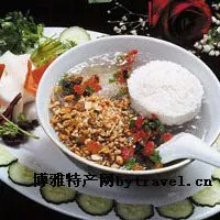 相傳清光緒年間,貴陽(yáng)一盧姓小販,用糯米粉加碗耳糕,磨成漿汗甑蒸熟,其色潔白,松色如雪,遂用竹片劃成塊狀,點(diǎn)綴玫瑰、芝麻、桃仁米遂成風(fēng)味小吃,人稱(chēng)"盧糕粑",后又有城隍廟側(cè)(大同街西口)宋姓小販,改作園形,不加佐料,做成"宋糕粑"。園形糕粑配以荸薺粉調(diào)好的“稀飯”,即成貴陽(yáng)人愛(ài)吃的“糕粑稀飯”,味道甜美,現(xiàn)貴陽(yáng)甜品店可以嘗到。( 貴陽(yáng))